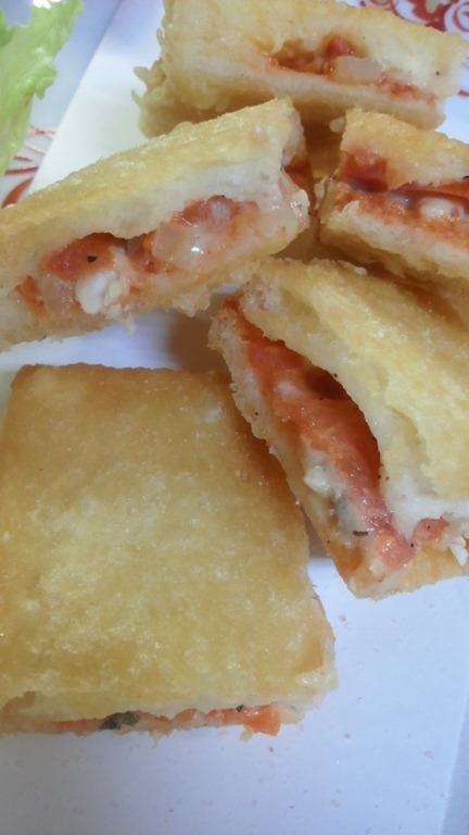 長崎の郷土料理である「ハトシ」です。 今日はトマト、エビすり身、マヨネーズetc が入ってます。 外はサクサク。中はジューシーです^^